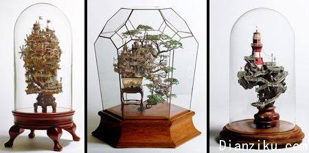 日本艺术家Takanori Aiba在小岩石和微型树木上建造小房子。利用纸 ,塑料,丙烯酸树脂, 钢丝 ,再生纸包装 ,石粘土,创造了独特的建筑 ,风车,灯塔。