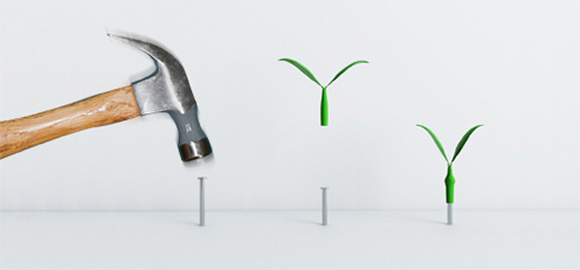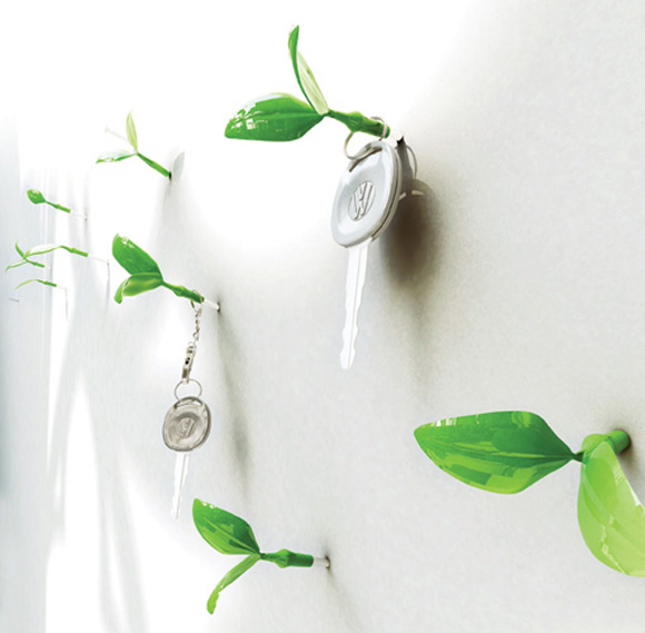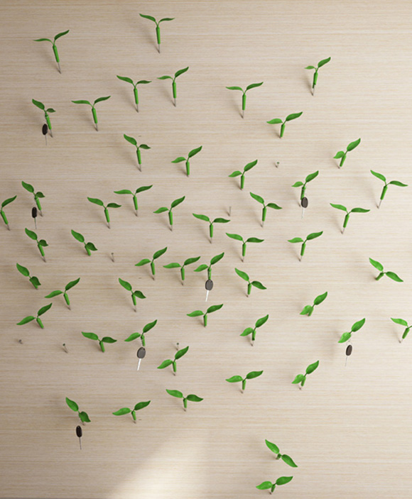 很多人都喜欢在再加墙壁上钉上几个挂钩来方便挂东西,市场上粘贴的,钉的,各式的都由。但是设计师Jeong Hwa Jin觉得钉子就可以,简单实用,价格还便宜,然后在配上他设计的嫩芽小帽就完美了,让整个墙壁都由一种生机盎然的景象。