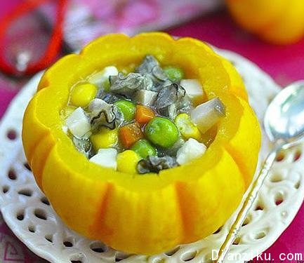这道菜的盛器是一个超大的南瓜,一端上来就感觉喜气洋洋,特别适合年夜做吉利菜。取名为五福临门之【金瓜鲜蘑海蛎煲】,五福分别指长寿、富贵、康宁、好德、善终。 这里用到杏鲍菇,海蛎,金瓜,青豆,豆腐五种主要食材。杏鲍菇能保健康长寿,金瓜,青豆代表富贵,金玉满堂;豆腐表示平安幸福,而海蛎是闽南人年夜一定要吃的食物。在一大通鱼肉饕餮之后,这道清鲜可口的海蛎煲能带给你清新的享受。
